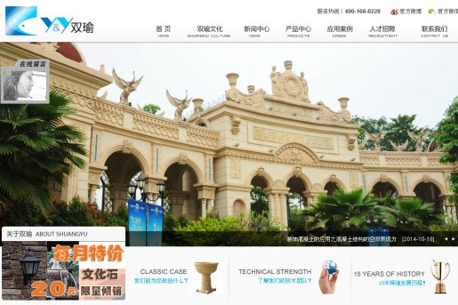 雙瑜建筑 雙瑜專業設計、制造、安裝、銷售建筑構件(GRC)及人造文化石等裝飾建材系列產品,規格品種達上千種,產品均通過中國國家級檢測。年產量達100萬平方米以上,產品暢銷國內外。 查看案例介紹