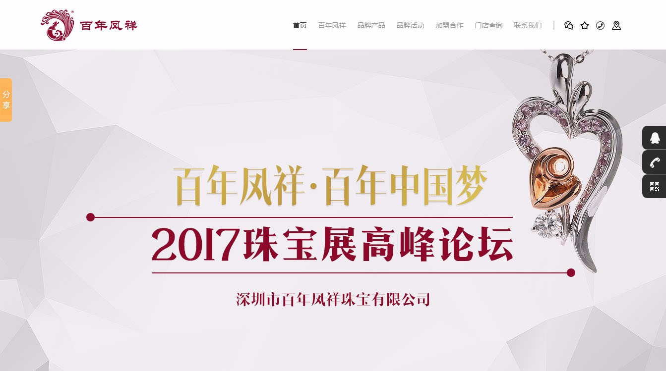 百年鳳祥珠寶品牌隸屬于深圳市百年鳳祥珠寶有限公司,是深圳市多利珠寶旗下全資控股子公司,創始于2003年。為了加快實現“百年鳳祥”品牌全國發展戰略目標,于2011年10月份在深圳國際珠寶產業園中心的翠竹大廈成立國內品牌運營中心,實現品牌全面升級和全國推廣業務。
