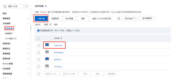 第一步:先將html文件上傳到對應(yīng)的bucket里,如下圖所示,點擊“文件管理”->“文件列表”->“上傳文件”上傳名為index.html的文件,然后再進行其他的配置
