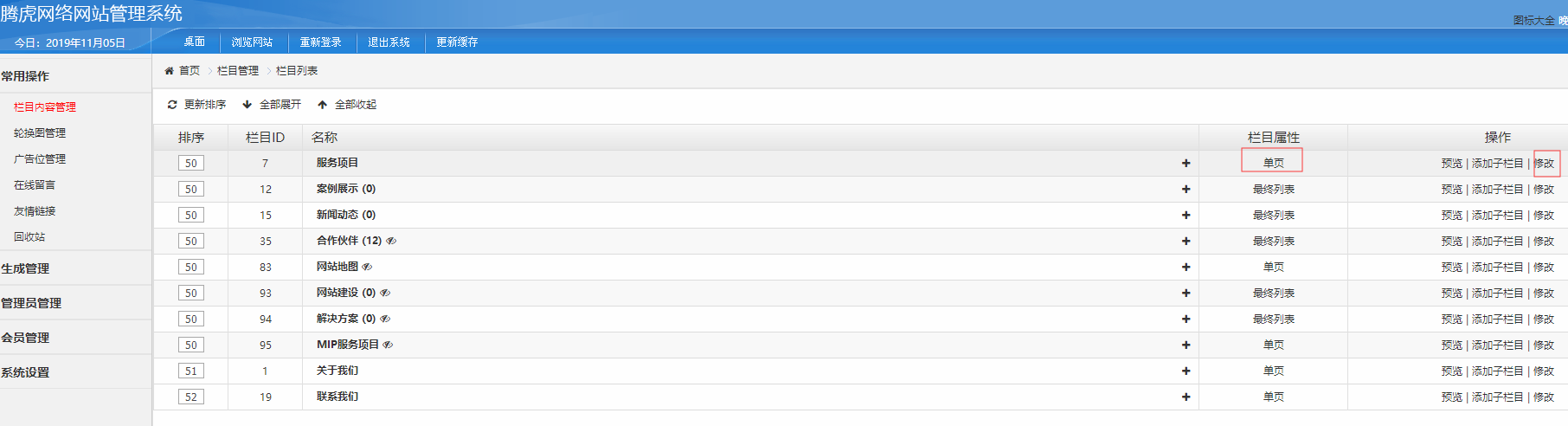 4.1 列表右側(cè)顯示是單頁(yè)的,并且點(diǎn)擊右側(cè)“+”號(hào),顯示沒(méi)有子分類(lèi)的,直接點(diǎn)擊更右側(cè) “修改” 按鈕 就可對(duì)該欄目進(jìn)行添加修改(如下圖)