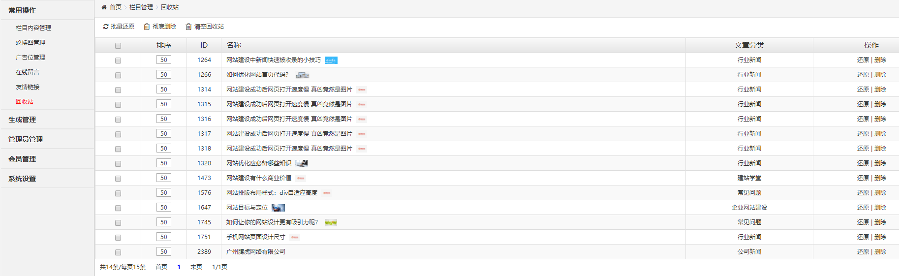 網(wǎng)站后臺(tái)刪除的產(chǎn)品新聞文檔等會(huì)先在回收站里,如果誤刪除,在回收站找到誤刪除的文檔,點(diǎn)擊“還原”就可以恢復(fù) ;點(diǎn)擊“批量還原”可以批量還原刪除的文檔;點(diǎn)擊“清空回收站”回收站就沒(méi)有文件了,也再找不回了;和電腦的回收站類(lèi)似(如下圖)