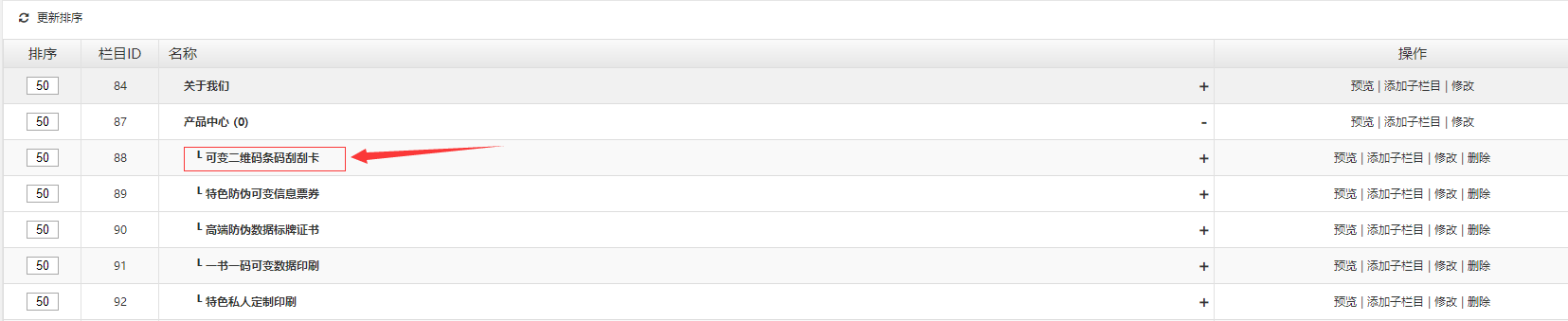 點(diǎn)擊產(chǎn)品中心右側(cè)“添加子欄目”可以添加產(chǎn)品分類(lèi),點(diǎn)擊產(chǎn)品中心右側(cè)“+”號(hào)展開(kāi)分類(lèi),如點(diǎn)擊“可變二維碼條碼刮刮卡”,可以添加這個(gè)分類(lèi)下的產(chǎn)品。添加產(chǎn)品文檔和“添加新聞文章界面說(shuō)明”一樣,同上;