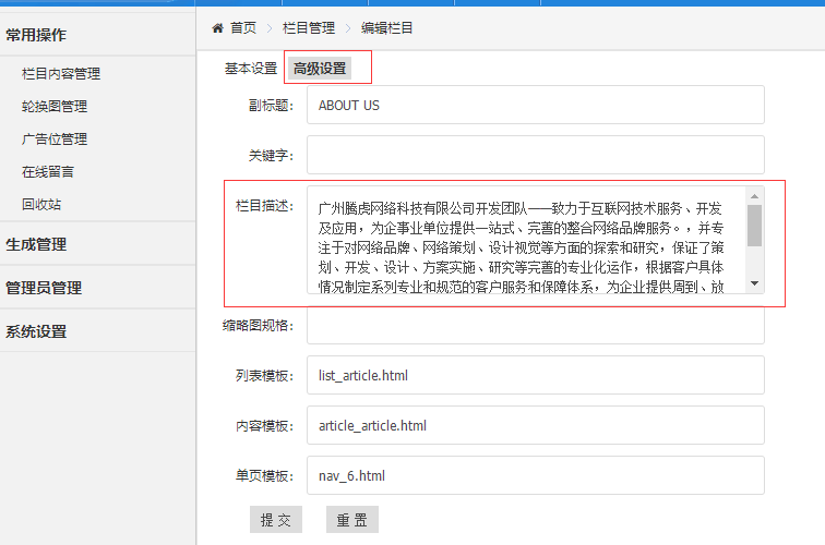 點(diǎn)擊一個(gè)欄目右側(cè)修改,進(jìn)入欄目?jī)?nèi)頁(yè)再點(diǎn)擊“高級(jí)設(shè)置”,在“欄目描述”里添加文字,再點(diǎn)更下邊的“提交”就可以了
