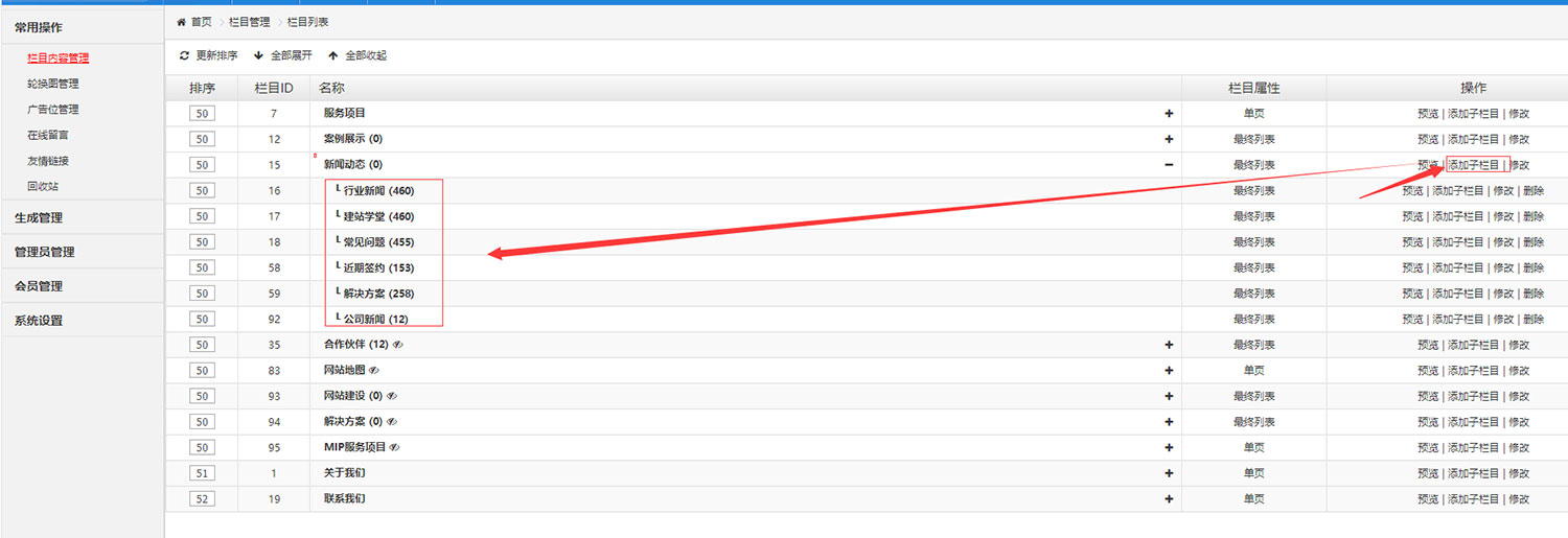 在網(wǎng)站后臺(tái)初始界面點(diǎn)擊“欄目?jī)?nèi)容管理”,出現(xiàn)所有欄目的列表,然后找到“新聞動(dòng)態(tài)”欄目,點(diǎn)擊右側(cè)的“添加子欄目”,可在“新聞動(dòng)態(tài)”欄目下添加二級(jí)欄目(如下圖)