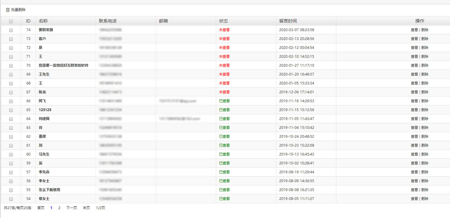 前臺(tái)通過(guò)在線(xiàn)留言提交的留言?xún)?nèi)容列表,可以在這個(gè)欄目查看、刪除。點(diǎn)擊左側(cè)在線(xiàn)留言,顯示留言列表,點(diǎn)擊右側(cè)查看可以看到前臺(tái)客戶(hù)提交的留言?xún)?nèi)容 (如下圖)