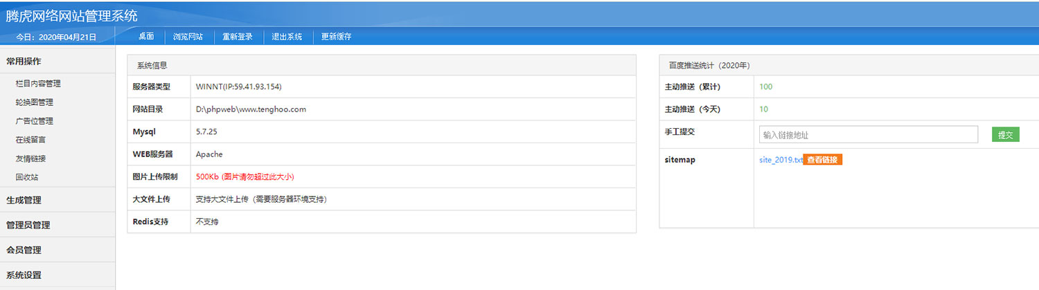 1.2 輸入網(wǎng)站管理員用戶(hù)名、密碼與驗(yàn)證碼后點(diǎn)擊確定后便可進(jìn)入網(wǎng)站后臺(tái)初始界面。點(diǎn)擊“瀏覽網(wǎng)站”可以打開(kāi)前臺(tái)網(wǎng)站;點(diǎn)擊“桌面”可以在其他頁(yè)面時(shí),比如打開(kāi)了關(guān)于我們頁(yè)面后再點(diǎn)擊“桌面”可以回到網(wǎng)站后臺(tái)初始界面;點(diǎn)擊“退出登錄”可以退出后臺(tái);點(diǎn)擊“重新登錄”可以重新登錄后臺(tái);點(diǎn)擊“更新緩存”可以更新網(wǎng)站緩存(如下圖)
