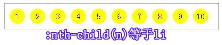 :nth-child(n),其中n是一個(gè)簡單的表達(dá)式,那么"n"取值是從“0”開始計(jì)算的,到什么時(shí)候結(jié)束我也不知道,如果你在實(shí)際應(yīng)用中直接這樣使用的話,將會(huì)選中所有子元素,比如說,在我們的demo中,你在li中使用":nth-child(n)",那么將選中所有的"li",如: