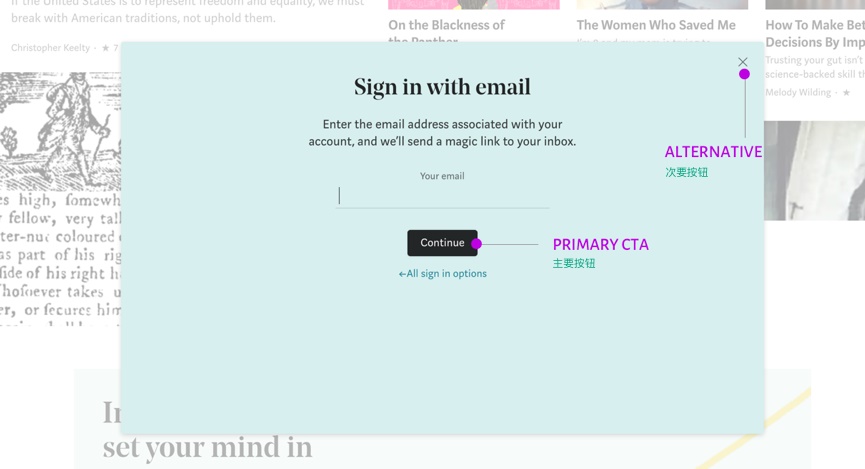 △ Medium的登錄模態(tài)彈窗使用X icon 來代表關(guān)閉按鈕