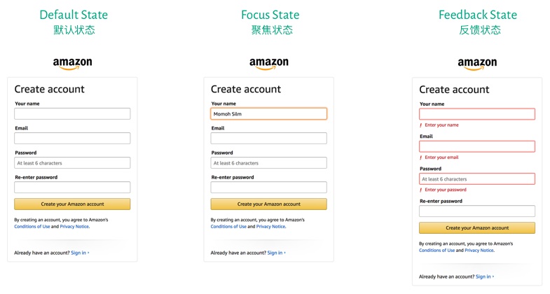 △ Amazon創(chuàng)建賬戶表單的「默認(rèn)、聚焦、反饋」頁面狀態(tài)