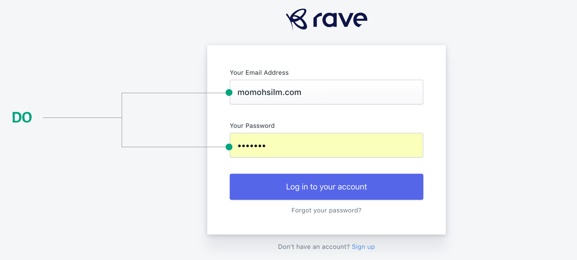 △ Flutterwave’s Rave的登錄頁面,輸入?yún)^(qū)域的尺寸與預(yù)期的輸入字段的長度比例一致